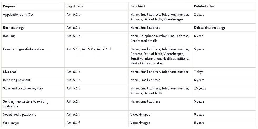 This is the data we can collect; purpose, legal basis, which data and retention time after last interaction.