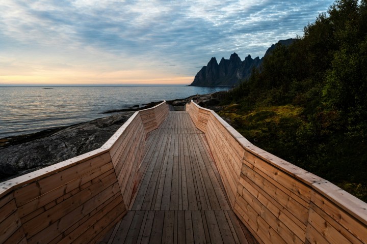 Follow the wooden walkway out to views of the legendary Okshornan mountain range. These jagged peaks rising directly from the sea create one of the most iconic panoramas in all of Northern Norway.