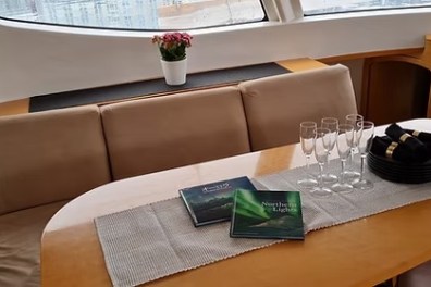 Cabins: Below deck, there are 4 double bedrooms with en suite bathrooms and heating. All cabins have warm duvets with top-class linens and towels.